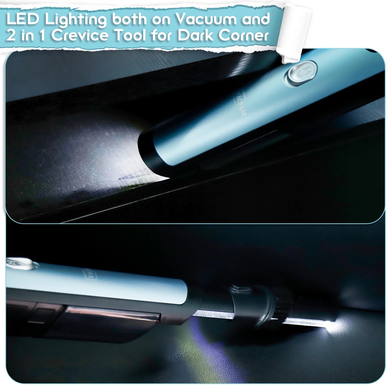 ✅ Éclairage LED pour les recoins sombres : grâce à sa conception ingénieuse, notre aspirateur sans fil est équipé de lumières LED non seulement sur l’aspirateur lui-même, mais aussi sur l’embout pour les recoins. Elles permettent d’éclairer tous les recoins sombres et difficiles d’accès, comme sous un siège de voiture. Nettoyer les zones sombres devient un jeu d’enfant avec notre aspirateur pratique, que ce soit à la maison ou en voiture.